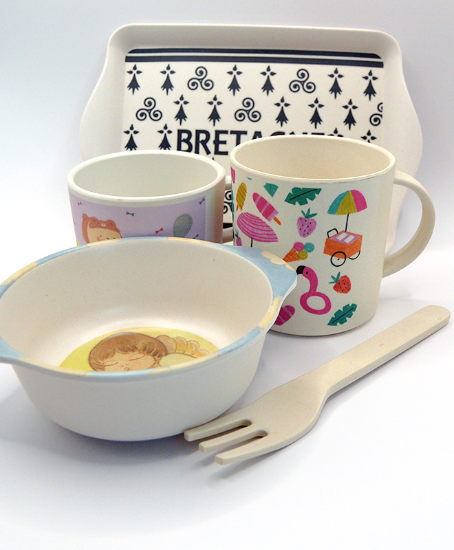 バンブーファイバーを粉状にしたものに、コーンスターチやアミノ酸由来の樹脂を混ぜて作られる食器類は、エコでかわいいと評判です。